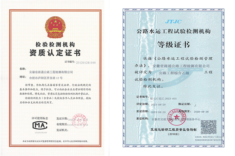 安徽省路通公路工程檢測(cè)有限公司成立于2003年7月?,F(xiàn)擁有公路工程綜合乙級(jí)檢測(cè)資質(zhì)、排水管道檢測(cè)及評(píng)估作業(yè)能力III級(jí)作業(yè)證書,并通過(guò)了檢驗(yàn)檢測(cè)機(jī)構(gòu)資質(zhì)認(rèn)定。2021年12月16日,獲批“高新技術(shù)企業(yè)”。各專業(yè)試驗(yàn)檢測(cè)人員配備齊全,具備開(kāi)展集料、鋼材、土工、瀝青及瀝青混合料、水泥及水泥混凝土、砂漿、無(wú)機(jī)結(jié)合料、水、外加劑、磚以及路基路面、混凝土結(jié)構(gòu)物、基坑地基與基樁、橋梁結(jié)構(gòu)、交安設(shè)施、公路與橋梁技術(shù)狀況和城鎮(zhèn)排水管道檢測(cè)等多項(xiàng)試驗(yàn)檢測(cè)的能力。