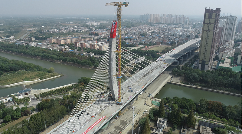 獨(dú)塔斜拉橋?yàn)楸卷?xiàng)目控制性工程,主塔采用“主體立面為月形,下塔柱為圓形鏤空”的混凝土塔,塔身高度近百米,塔西邊次跨84米+塔東邊主跨152米,主跨152米在老橋上面跨越店埠河,施工難度較大。自2021年8月22日主塔建設(shè)以來(lái),項(xiàng)目管理人員克服施工技術(shù)難點(diǎn),嚴(yán)把關(guān)鍵工序,應(yīng)用變曲線鋼筋分段預(yù)制、鋼木組合模板、制作索導(dǎo)管精平定位裝置等多項(xiàng)新技術(shù),平穩(wěn)快速推進(jìn)施工進(jìn)度。在項(xiàng)目部全體人員的共同努力下,完成主塔封頂,并實(shí)現(xiàn)國(guó)慶當(dāng)天道路地面系統(tǒng)通車(chē)放行。預(yù)計(jì)年底完成全線建成通車(chē)任務(wù),建設(shè)工期合理縮短了9個(gè)月。